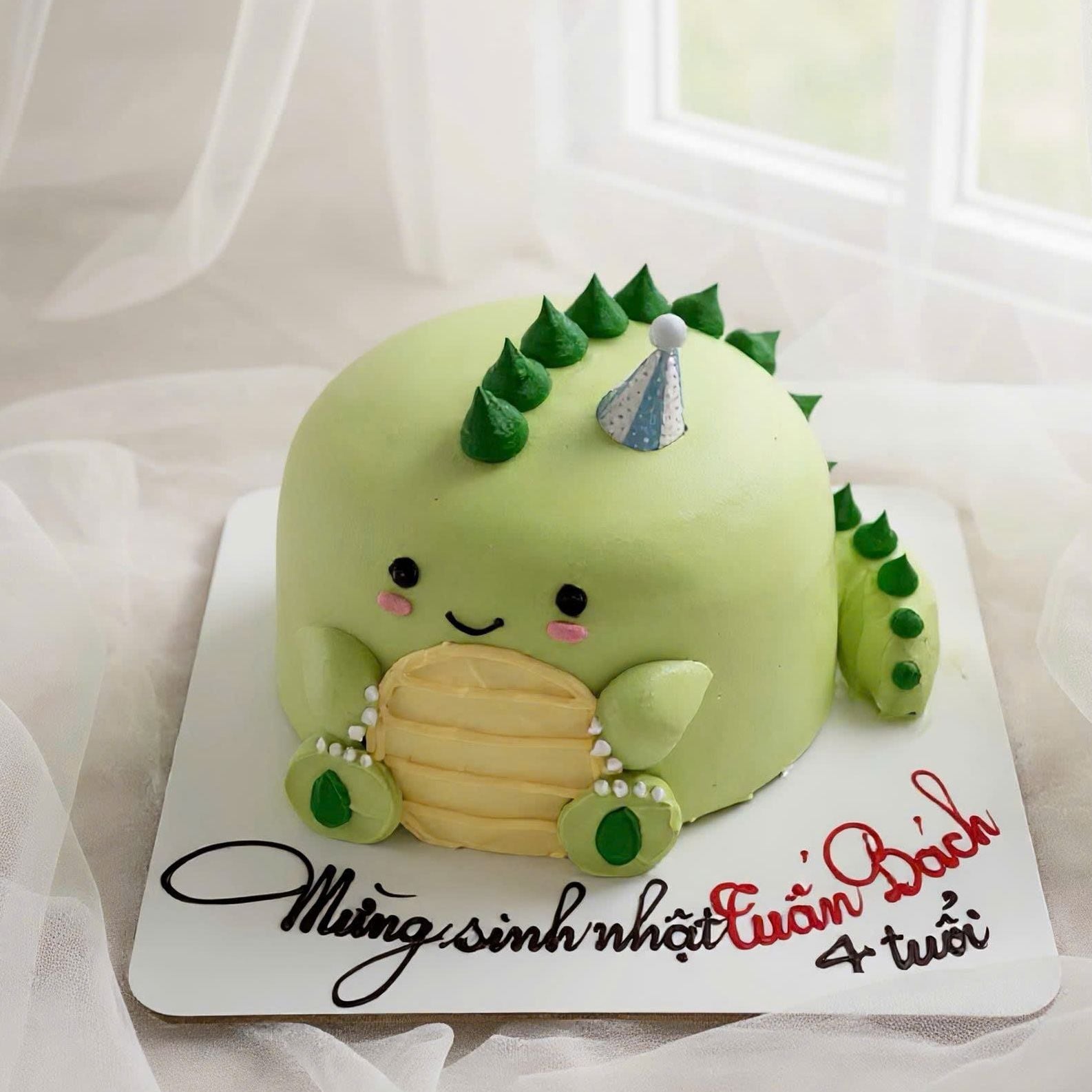 Bánh Gato tạo hình dành cho các bé yêu thích khủng long. Sản phẩm không sử dụng chất bảo quản, trang trí bằng màu thực phẩm an toàn cho sức khỏe, đạt tiêu chuẩn kiểm định chất lượng. Bánh có thể đổi cốt gato và vị kem tươi tùy thích.
